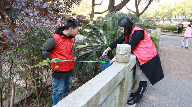 活動(dòng)中,黨員志愿者們充分展現(xiàn)了不怕臟、不怕苦、不怕累,敢于沖在前面、敢于搶挑重?fù)?dān)的精神風(fēng)貌。向陽(yáng)湖內(nèi)側(cè)綠化帶因有石板護(hù)欄隔離,存在多處衛(wèi)生死角,清理垃圾非常不便。年輕黨員志愿者主動(dòng)認(rèn)領(lǐng)任務(wù),迅速組團(tuán)配對(duì),有的爬過(guò)護(hù)欄跳入綠化帶內(nèi)進(jìn)行清理,有的在旁傳遞垃圾袋,有的一手提著垃圾袋,一手拿著垃圾夾子,對(duì)蓉園路沿線及南海賓館前坪的塑料袋、煙蒂、電池、玻璃瓶等不易降解的有毒有害垃圾進(jìn)行清理。